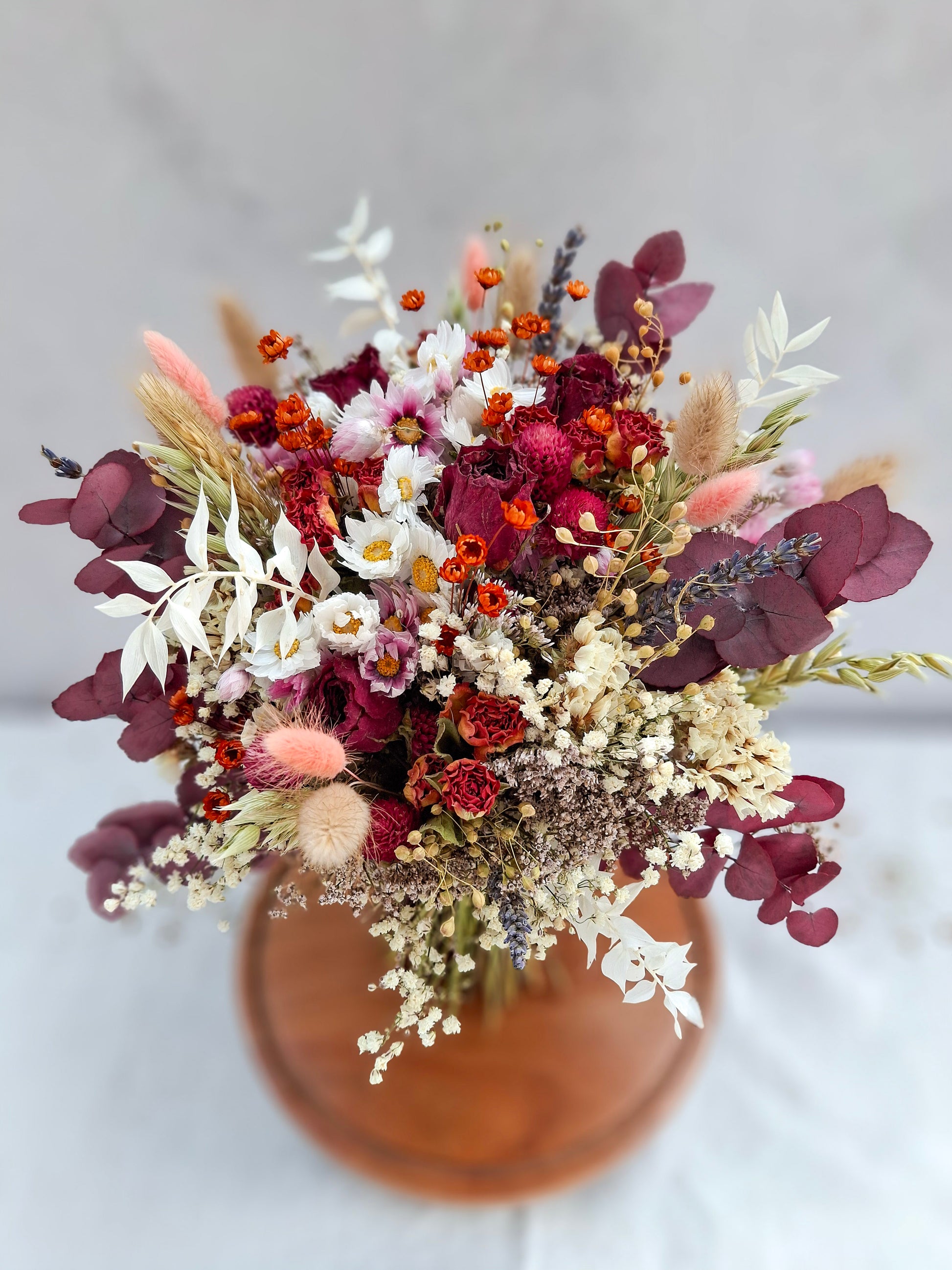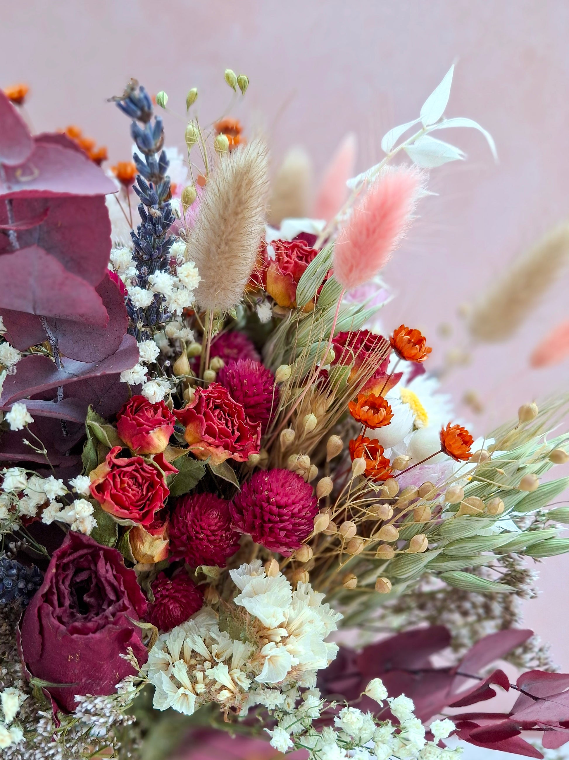 A natural, rustic dried flower bouquet inspired by wildflower meadows and late summer sunsets! This colourful, autumnal, dried flower arrangement is handcrafted with crisp white foliage and eucalyptus in burgundy tone to complement the orange and berry roses. The palette is warm, yet bold and whimiscal, with a relaxed, meadow-gathered feel. It will pair beautifully with burned orange, rust, terracotta, burgundy, and soft or berry pink colour schemes.