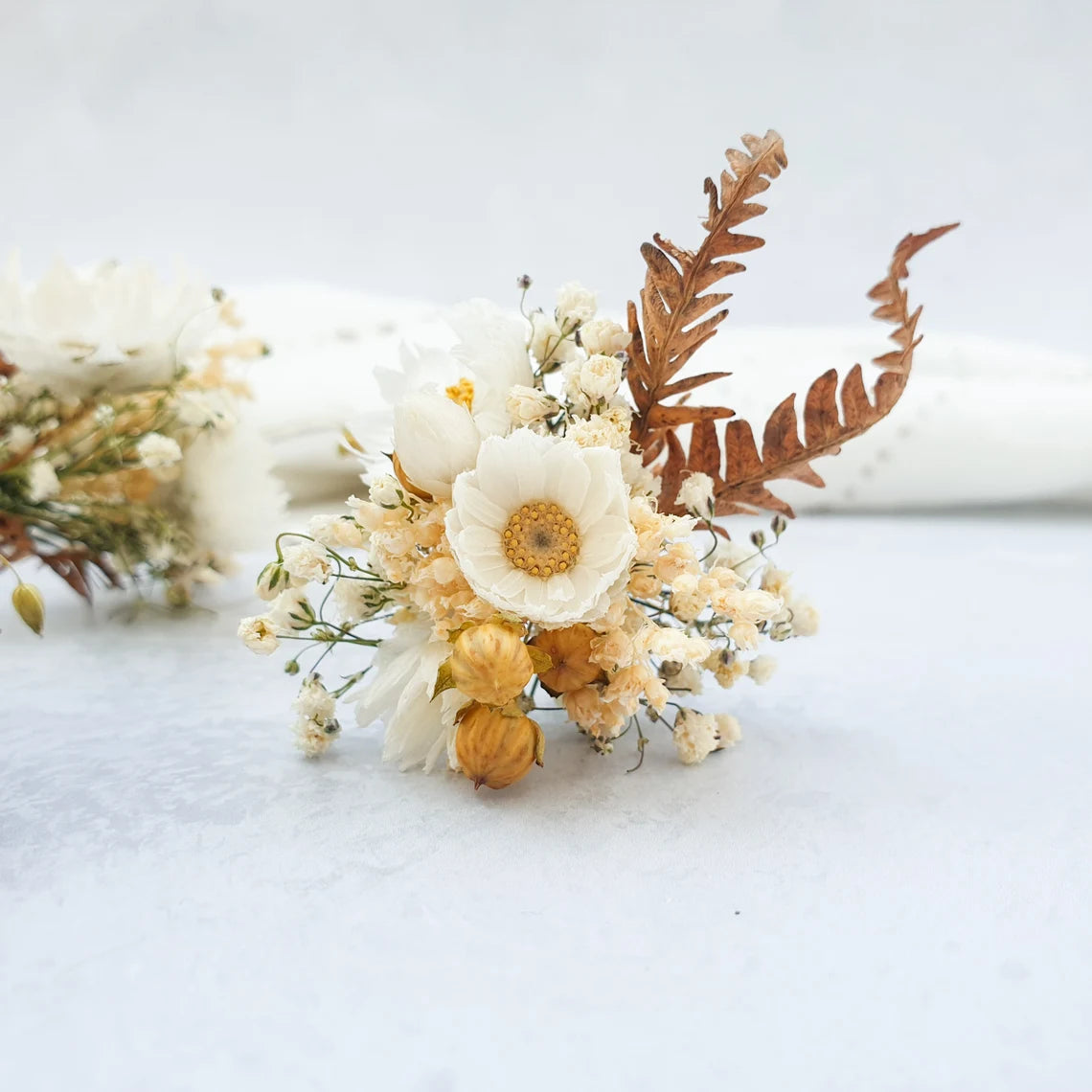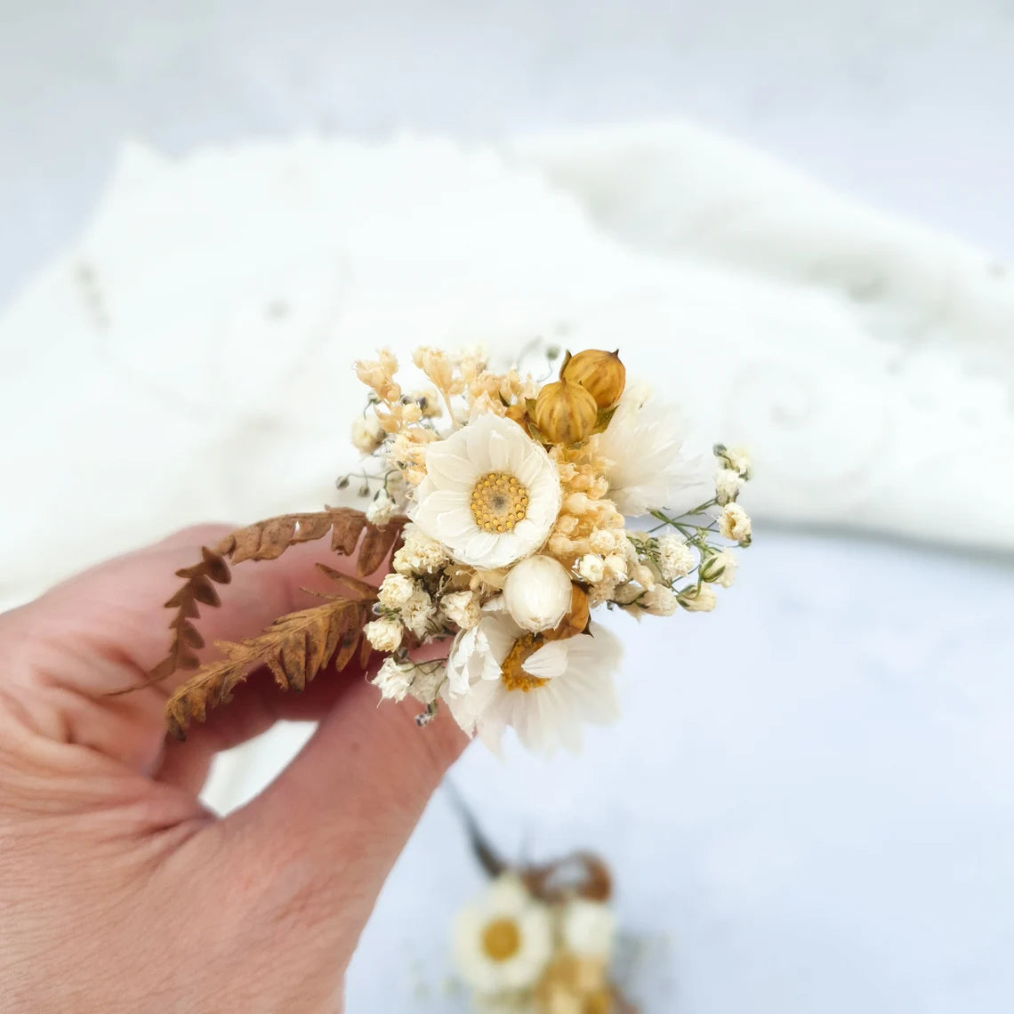 These dried flower hair pieces contain a selection of daisies, natural bracken fern, linum and gypsophila.