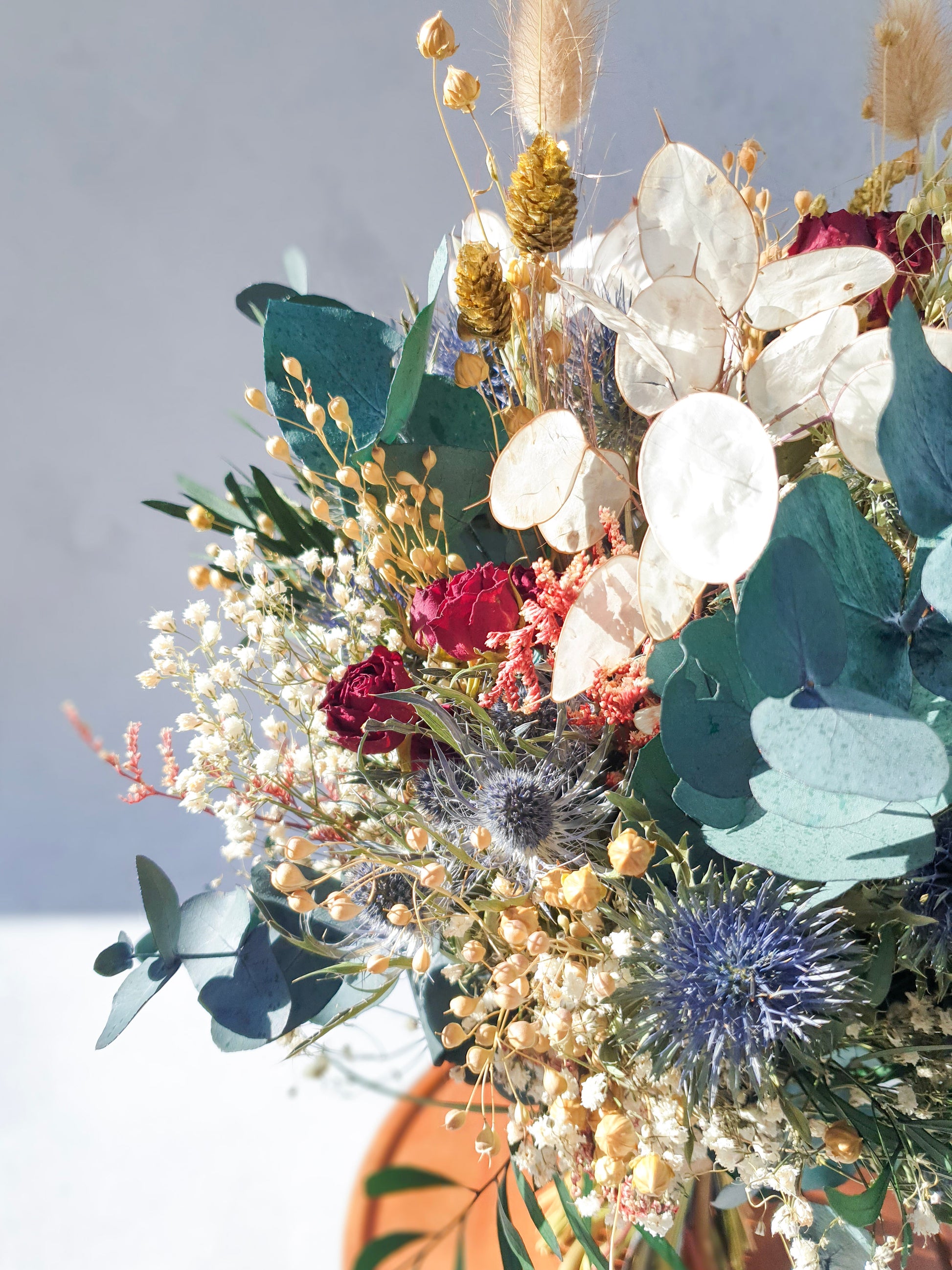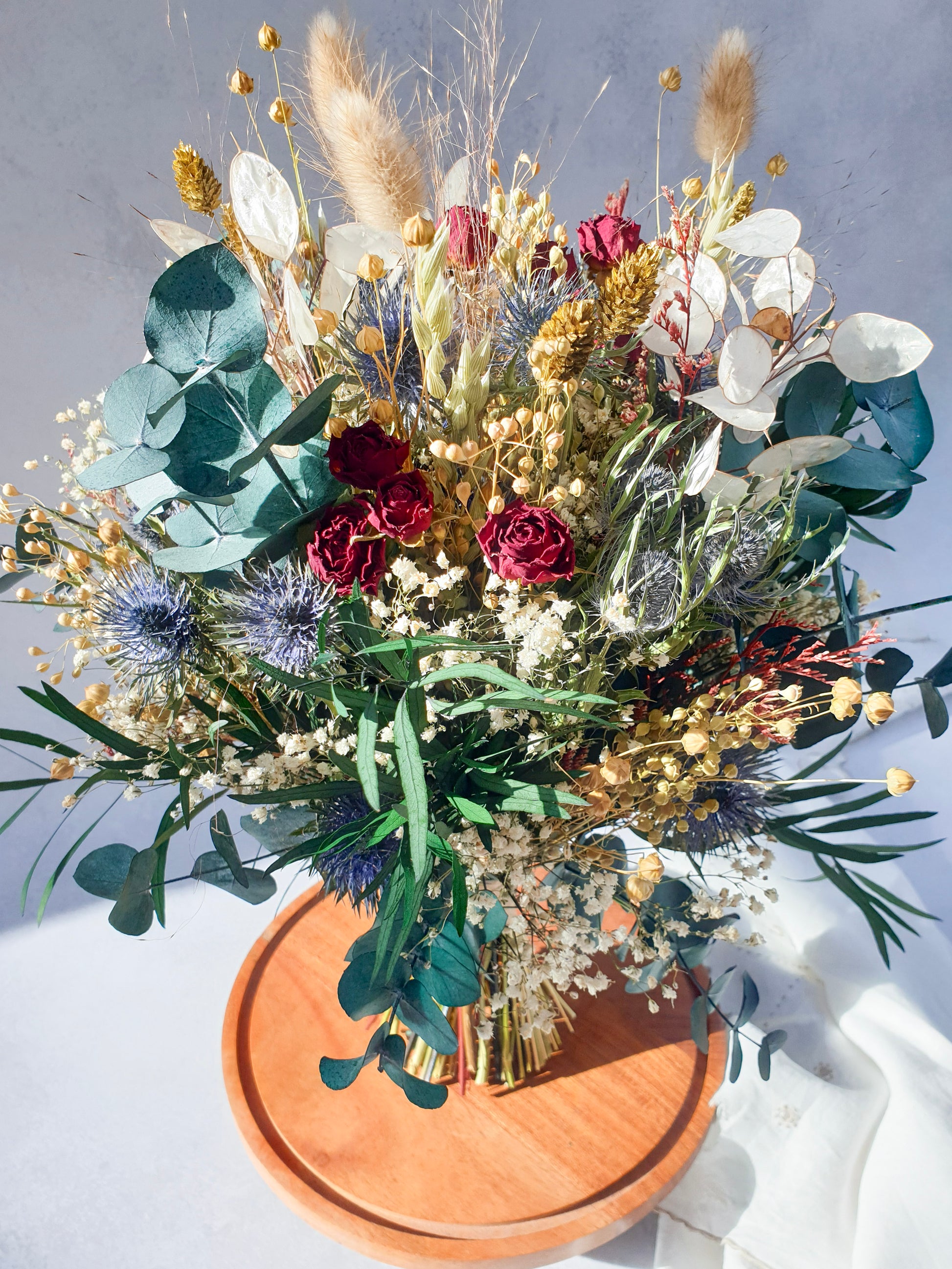 This seasonal arrangement brings together warm tones and natural texture in a polished, festive style. Dried roses form the focal point, supported by thistles, and lunaria seed pods for subtle shape and contrast. Preserved foliage and soft grasses in natural and metallic tones create a full, layered base that gives the bouquet its signature wild-but-elegant look.