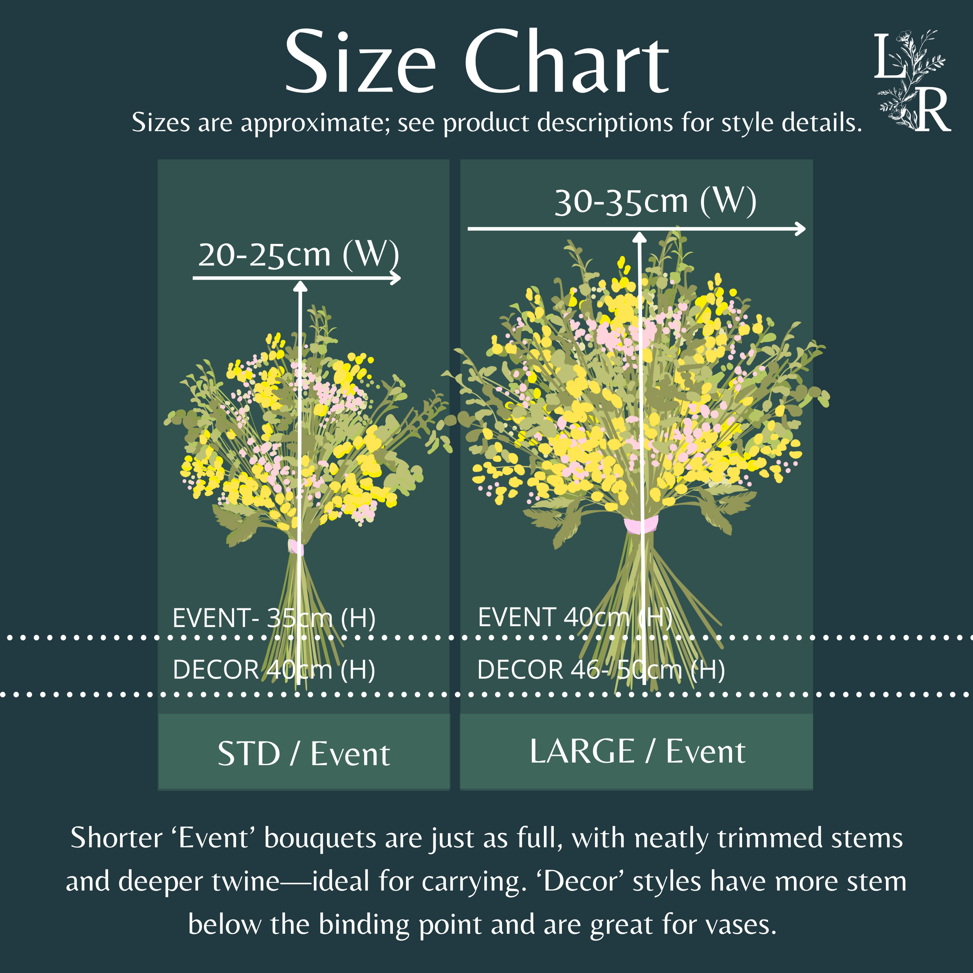 *Please see image in gallery for approximate sizes. Bouquet sizes are approximate. Every design at Lytton Rose Botanical is made by hand, and natural variations in flower shape, stem length, and the way foliage sweeps or curves can affect the final measurements. We follow the size guide as closely as possible, but each bouquet has its own character and may differ slightly from the dimensions shown.